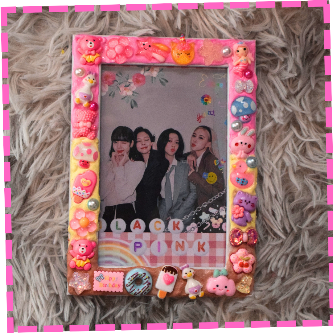 Marco de fotos de decoden falso , crema falsa y figuras de resina Tema de Black Pink 4x6 .